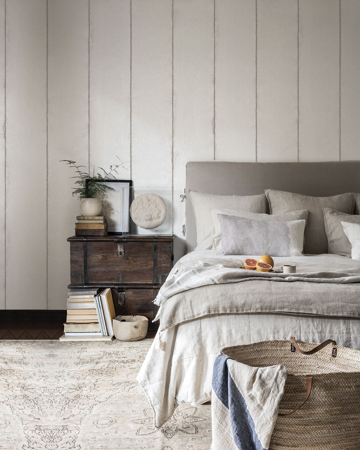 Habitación con una pared con el papel mural Aire con elegantes rayas verticales en grises, para un diseño minimalista y sofisticado, fácil de limpiar y duradero.