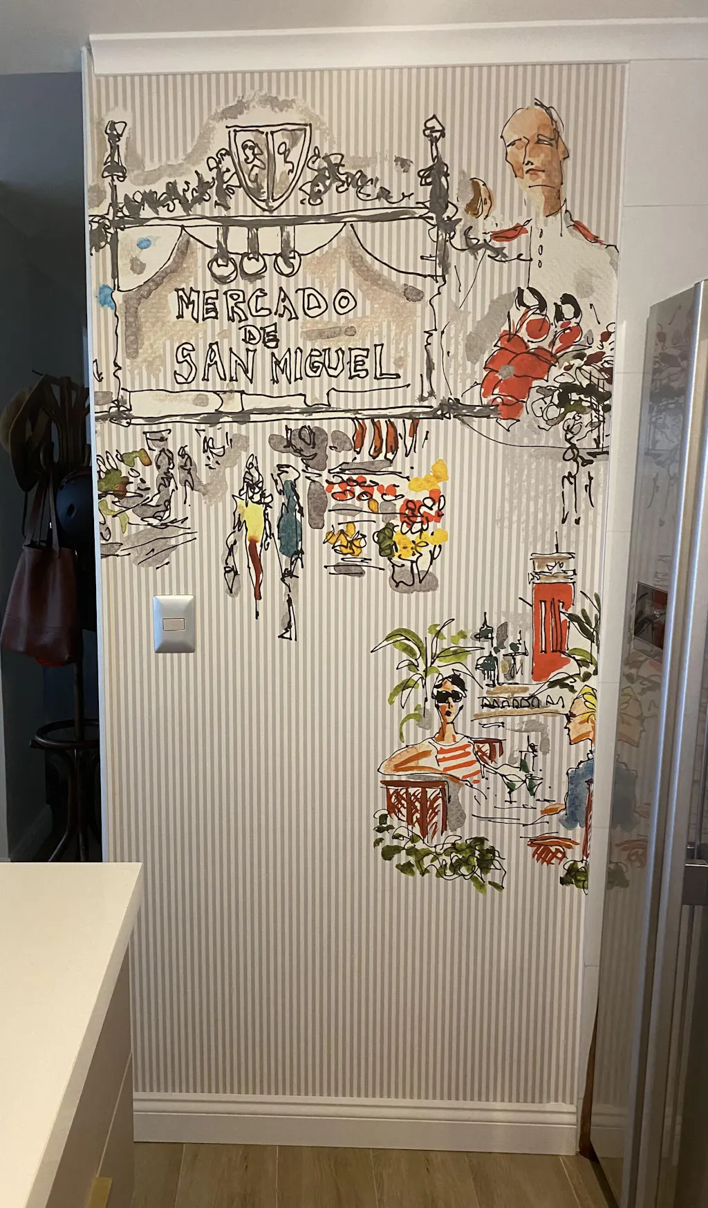 Dale vida a tus a tus espacios con el papel mural MERCADO SAN MIGUEL un collage de ilustraciones del icónico mercado madrileño, pero con un carácter personal e ilustrativo Un diseño que da vida a cualquier espacio, es resistente y fácil de limpiar, asegurando un aspecto impecable con el mínimo esfuerzo.